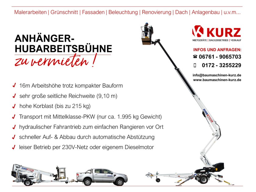 Unsere DINO 160XT ist eine kompakte und leichte Arbeitsbühne und kann daher auch mit kleineren Zugfahrzeugen problemlos transportiert werden. Dennoch bietet die DINO 160 XT stolze 9,10 m Reichweite bei 215 kg Korblast im kompletten Arbeitsbereich.